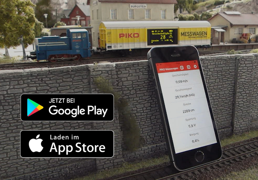The PIKO HO measuring car is an innovation in the model railroad sector! Finally, it's possible to measure a complete layout to the centimeter, and on inclines to the kilometer! In connection with a cell phone app (*Android or iOS) or a PC, the measurement data and information can be replayed live using WLAN. Graphical evaluations, etc. can be displayed on the PC and average speeds can be determined! In this way, accurate measurements are possible even in plant areas that are not visible. High-tech measuring is built into an attractive car model, which can be nicely integrated into a train set even without a measurement.